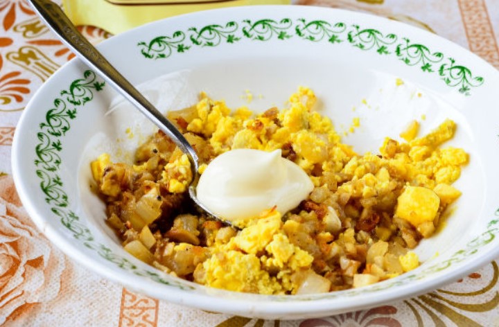 Mix the yolks and fried mushrooms, add a little salt and pepper. You can grind the yolks with a fork.