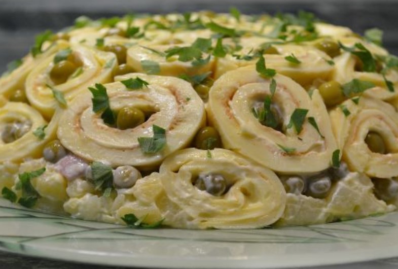 Before serving, turn the salad with egg pancakes on a serving dish with the pancakes up, remove the foil, garnish with mayonnaise, green peas and herbs.