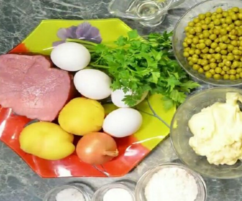 Combine meat with peas, 2-3 tbsp mayonnaise and mix thoroughly.