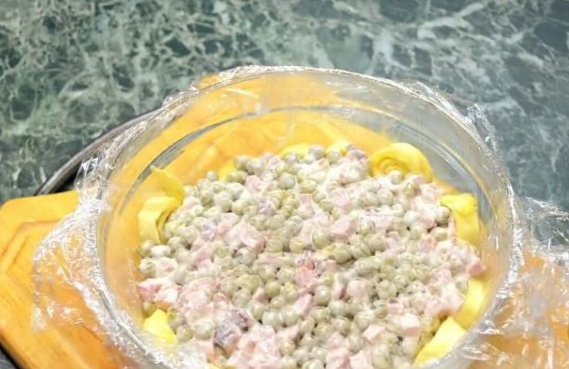Cover a deep round salad bowl with cling film, evenly place pancake rolls over the entire surface.