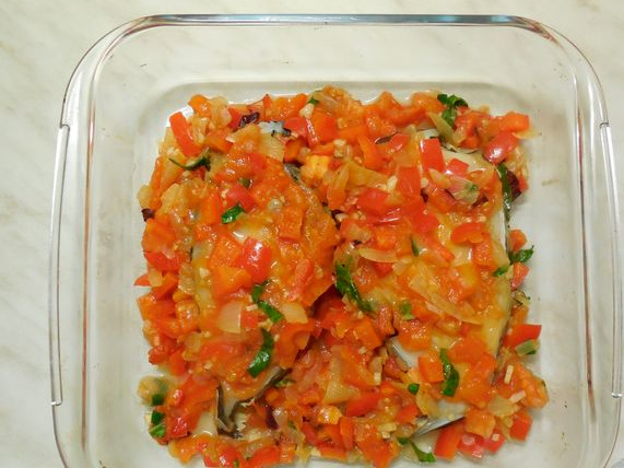 Spread the vegetable sauce over the fish. We bake the fish in the oven for about 30 minutes.