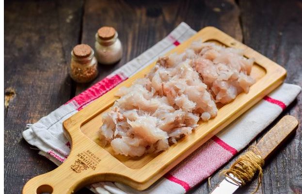 While the potatoes are boiling, wash and dry the fish, remove the fins and remnants of the entrails, cut the fillets from the ridge on both sides. Cut the resulting hake fillet into small pieces.