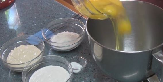 Put 5 eggs, 200 milliliters of sour cream, 200 milliliters of mayonnaise, 1 teaspoon of baking soda, and 5 tablespoons of flour in a mixer bowl. Stir in a mixer until a homogeneous dough is obtained.