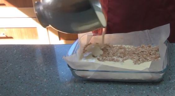 Fill with the remaining dough. We bake in a preheated oven at a temperature of 150 degrees Celsius for 1 hour.