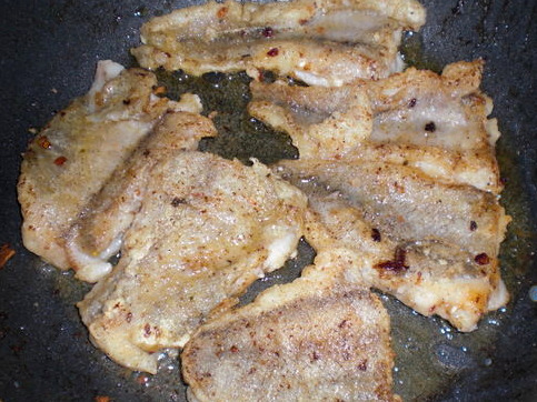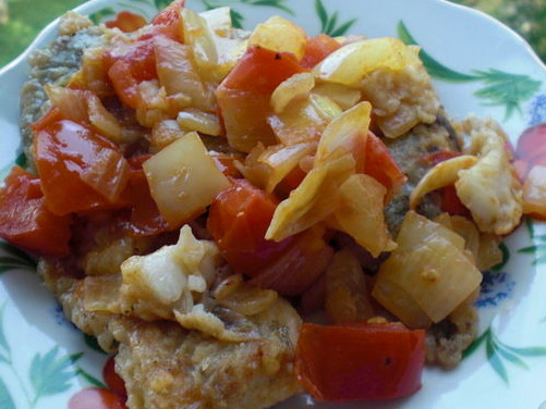 Place vegetables on a plate. Breaded fish fillets in flour, salt, and pepper. Fry in a skillet, in which the vegetables were stewed, until golden brown, on both sides.