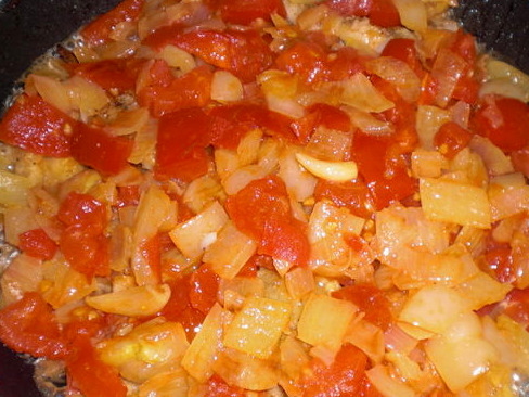First, let’s prepare the vegetable dressing. To do this, fry the onion and garlic in vegetable oil, stirring occasionally.