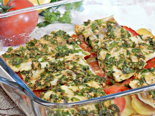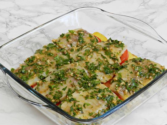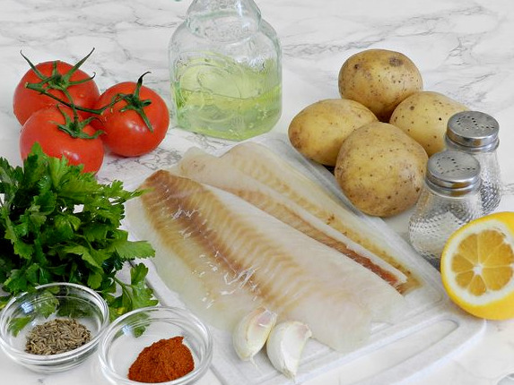 Fish, baked with potatoes and tomatoes, gets a special, incomparable taste and aroma thanks to the piquant Moroccan marinade sauce “chermula” with herbs, garlic and spices.