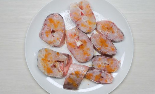 Cut the fish into slices, season with salt, and sprinkle with chili. Leave on for 10-12 minutes.
