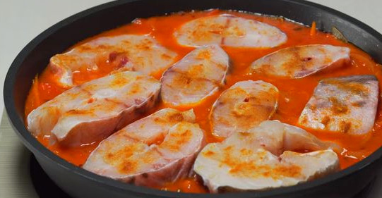 Add 200 ml of water to the vegetables and put the fish in the vegetable sauce. Close the pan with a lid and simmer the fish in tomato sauce with vegetables for 5 minutes over low heat. Then turn the fish over and simmer for another 5 minutes.