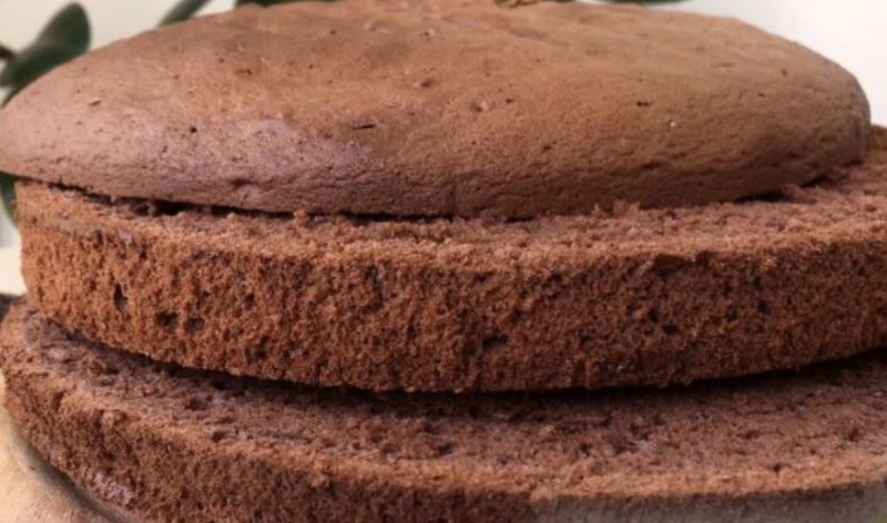 The second version of the chocolate biscuit with the addition of baking powder. We prepare the same dough and at the end, sift the baking powder together with the flour. Bake in the same way as the first biscuit. Height of chocolate sponge cake with baking powder 3.8 cm.