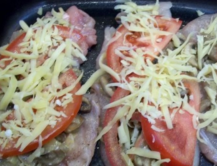 Then put mushrooms, onions, tomatoes and cheese on top. Place the French chicken in the oven for twenty minutes.