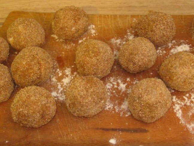 Roll out balls, the size of a nut, from the prepared mass. Pour flour into a plate. Thoroughly coat the meatballs in flour.