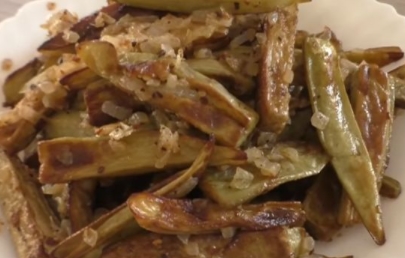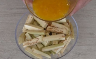 After the onion, fry the eggplants until golden brown, cook in batches. There is very little vegetable oil, the eggplants are saturated with eggs and do not absorb oil.