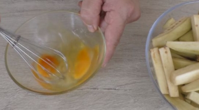 Peel the eggplants and cut into small cubes. Beat eggs with a pinch of salt.