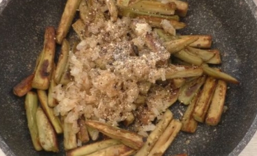 With the last batch of eggplants, return all the fried eggplants and onions to the pan. Add black pepper, salt and mushroom powder (if you add a salt cube, be careful). Mix everything and cool.