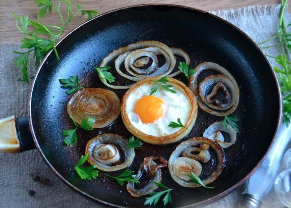 Tired of the usual scrambled eggs? Try scrambled eggs in a new way – in caramelized onion rings. Appetizing onion rings with a caramel aroma successfully complement the fried eggs. Fast and original breakfast dish!