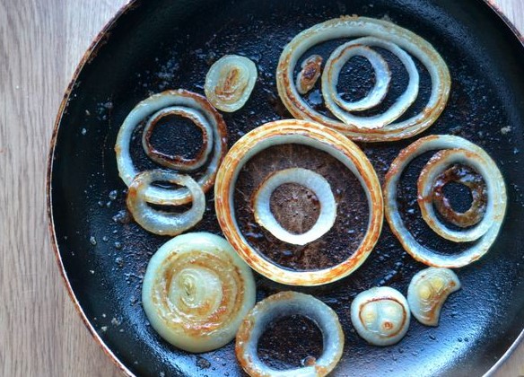 Heat the vegetable oil in a frying pan and put all the onion rings in it. Sprinkle sugar on the onion rings. Cover with a lid and fry the onions over low heat for about 2-3 minutes on each side. A caramel “crust” should appear on the onion rings.