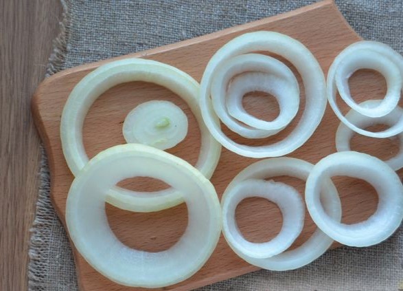Peel the onion, cut into slices 1-1.5 cm thick. Divide the sliced onion circles into rings. We do not separate the largest two rings in diameter, we leave them together so that they are not deformed and retain their shape. This is important because in this “double ring” we will be frying eggs.