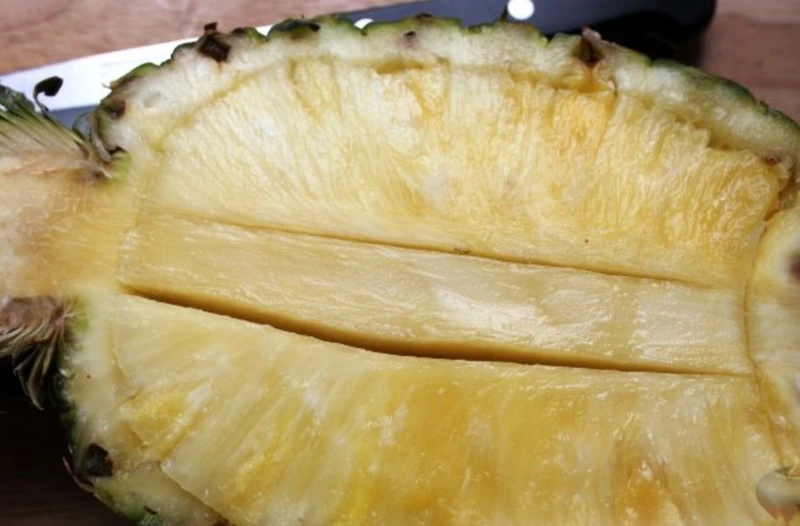 Cut the pineapple in half with a sharp large knife, together with the leaves.