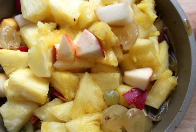 We put the caramelized fruits in prepared pineapple “fruit bowls”. Add slices of fresh tangerine. Fruit salad in pineapple is ready!