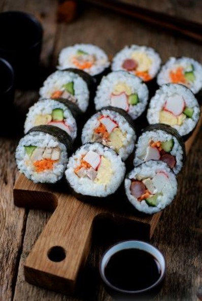 Gimbap is a Korean dish borrowed from Japanese cuisine. These are the same sushi rolls, only it contains more satisfying products: baked chicken, sausage, omelet, crab sticks, and a large number of vegetables. Unlike traditional sushi dressing, gimbap is seasoned with sesame oil.