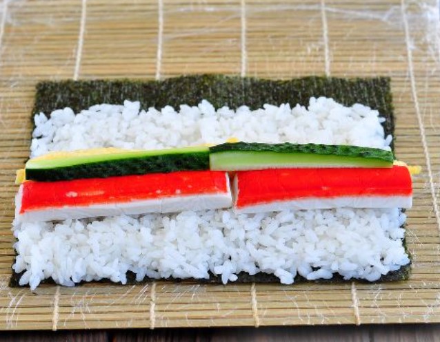 The first gimbap is made from crab sticks, omelet and cucumber.
