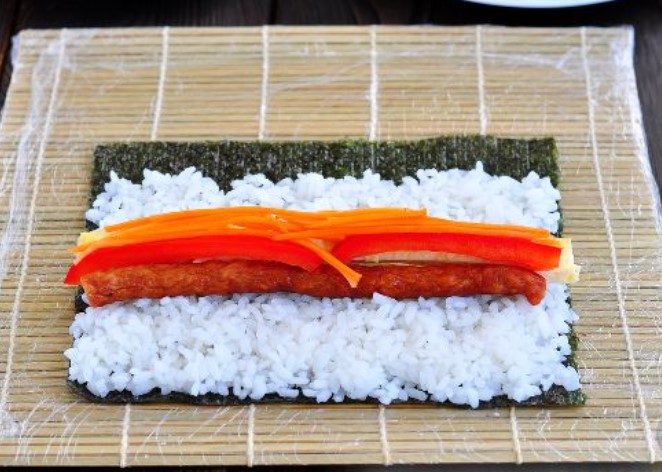 Prepare the third gimbap with smoked sausage, pickled carrots, scrambled eggs and bell pepper.