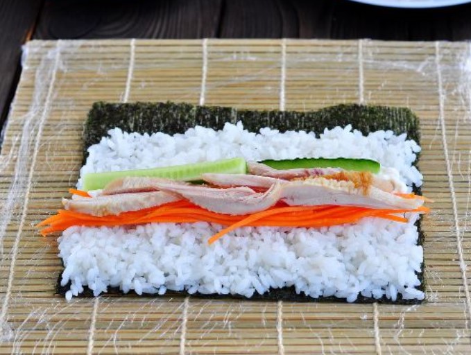 The second gimbap is prepared with baked chicken, pickled carrots, scrambled eggs and cucumber.