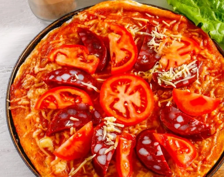 Cut smoked sausage and tomato (optional) into slices and place on the base. Sprinkle the remaining cheese on top. Place the pizza in the oven for 10-12 minutes.