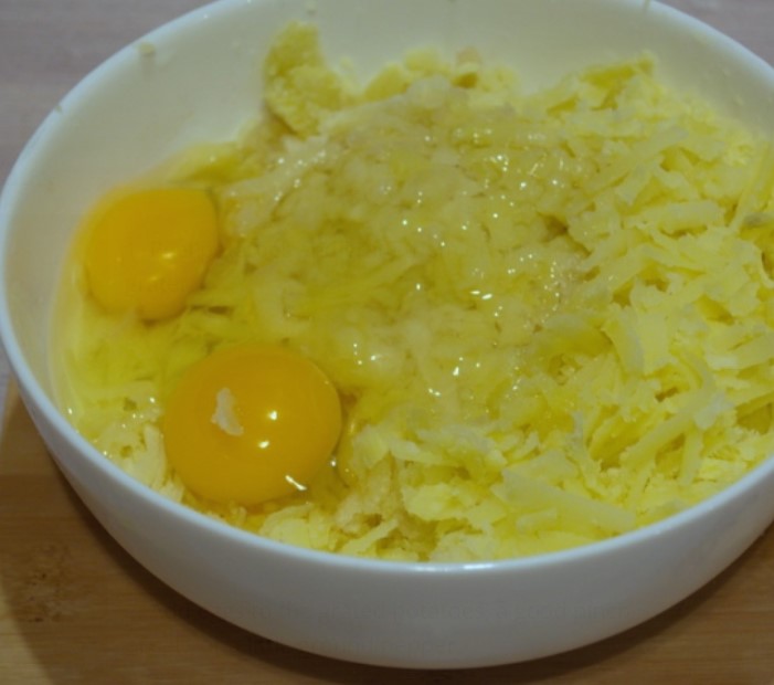 Add eggs to the grated potatoes, a good pinch of salt, or a little ground pepper.