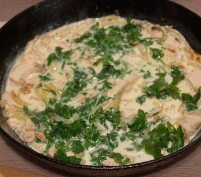When the meat and onions are browned, add the cream and lots of chopped herbs. Stir. Let it boil and turn it off.