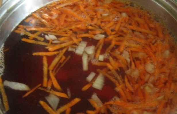 - Throw beets, carrots, onions, and potatoes into boiling water. Salt to taste.