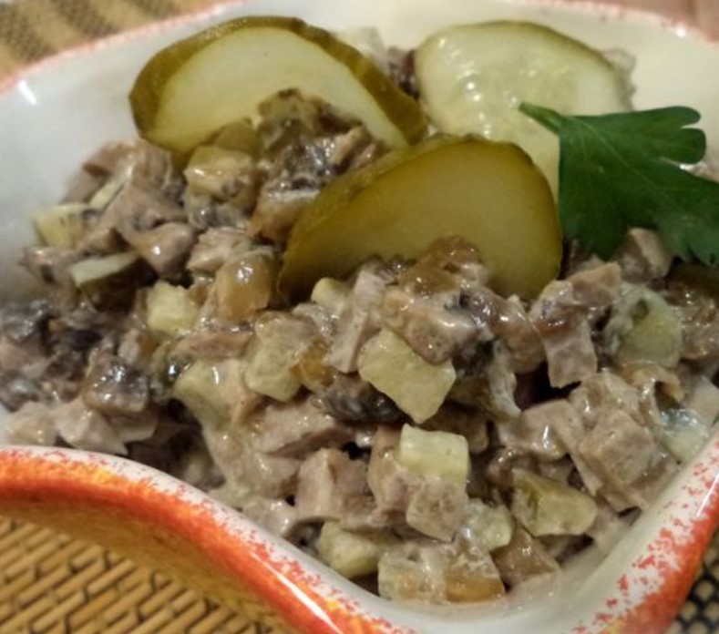 Delicious and easy-to-prepare salad “Delicacy” from boiled tongue, fried champignons and pickles.