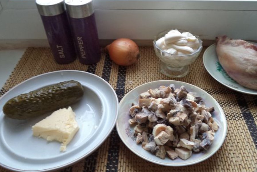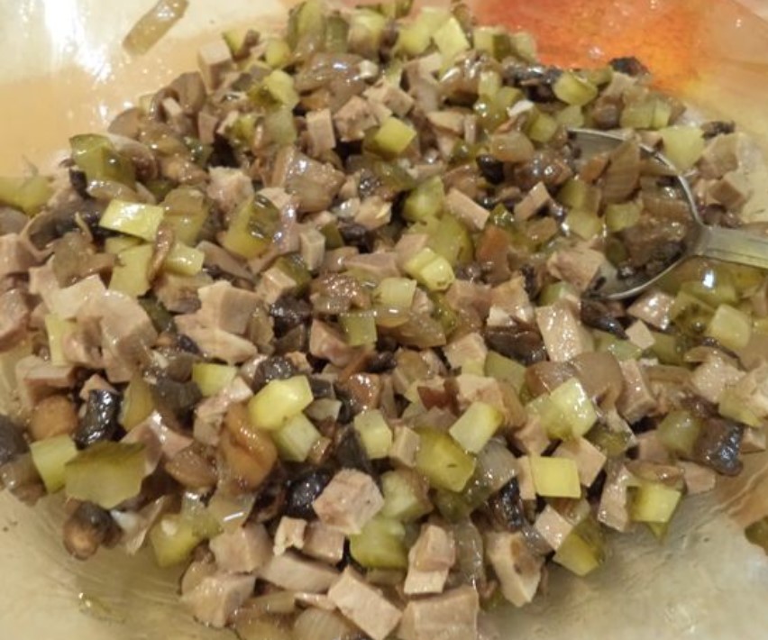 - Stir the boiled tongue with cucumbers, mushrooms and onions.