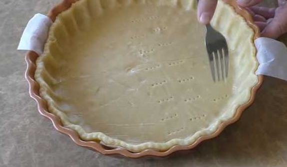 We transfer the dough together with the parchment into the mold, with the template circle down. We prick the dough with a fork, along the bottom and sides. We put the mold in the oven (we place the ceramic mold in a cold oven) and bake the base for the shortcrust pastry cake for 10-15 minutes at a temperature of 180 degrees.