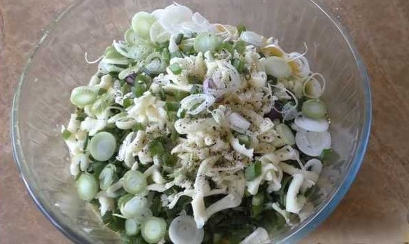 Add both types of onions, cheese and ground pepper there. Mix the filling well.