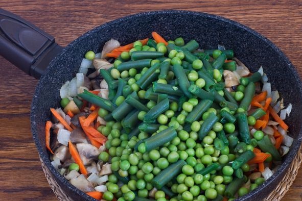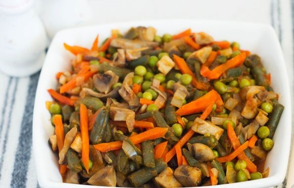 Cooked green beans, stewed with green peas and mushrooms, in tomato sauce, can be served both hot and chilled.