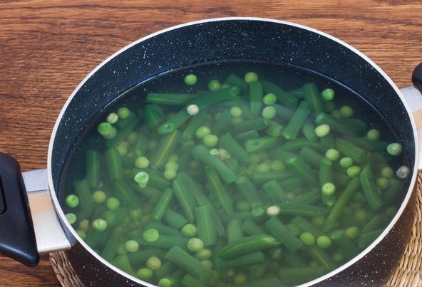In a saucepan, bring about 2 liters of water to a boil. Add frozen peas and green beans to boiling water. After boiling, cook for 5-6 minutes and drain in a colander.