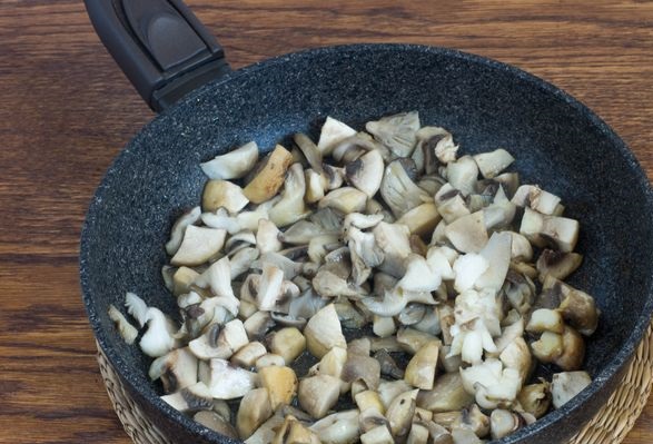 Heat vegetable oil in a skillet, add mushrooms. While stirring, fry the mushrooms over medium heat until lightly browned and the liquid evaporated completely.