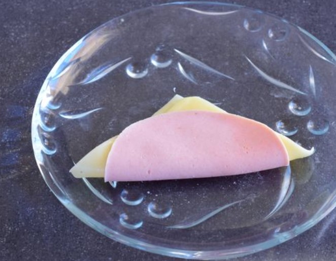 Fasten the edges of the triangle with a toothpick to make a cornet. Do this with all the ham and cheese slices.