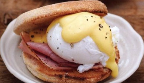 Ham and poached eggs with hollandaise sauce, served in crispy buns.