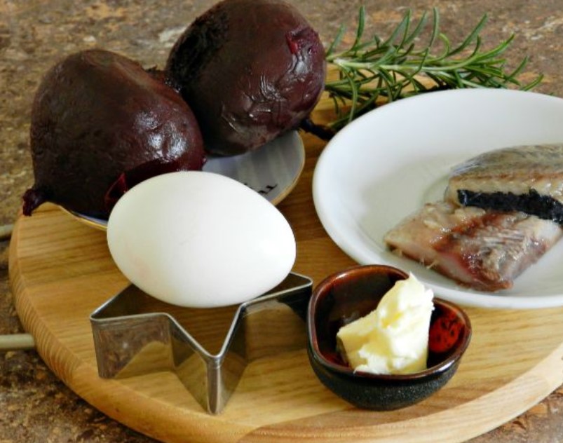 Ingredients for preparing herring and beetroot snacks.