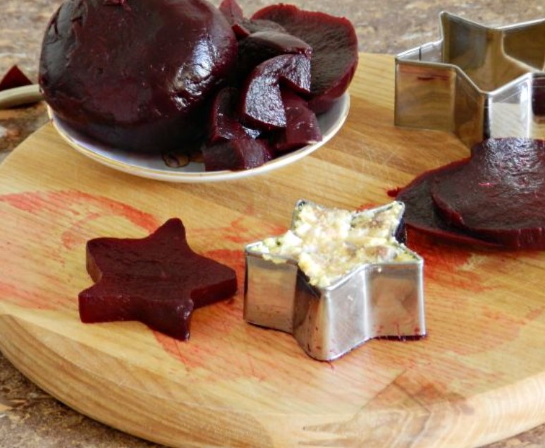 Cut shapes or just circles from beets with cookie cutters or a glass. (To reduce the color of the beets on other foods, you can blot them with paper towels.)