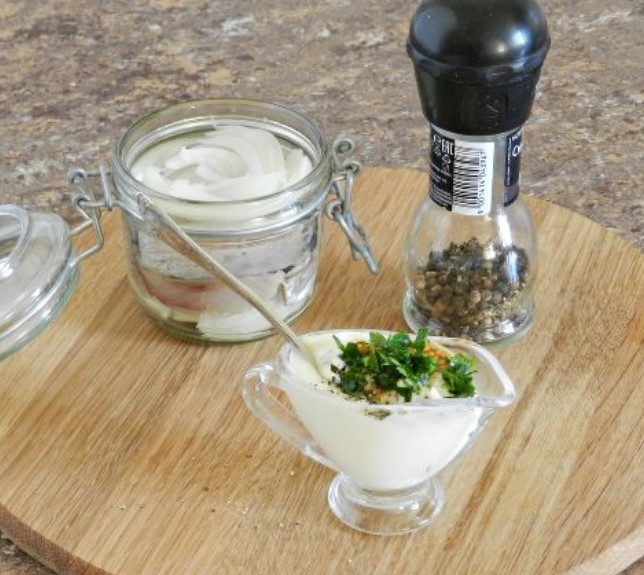 - Put onions and herring into a jar.