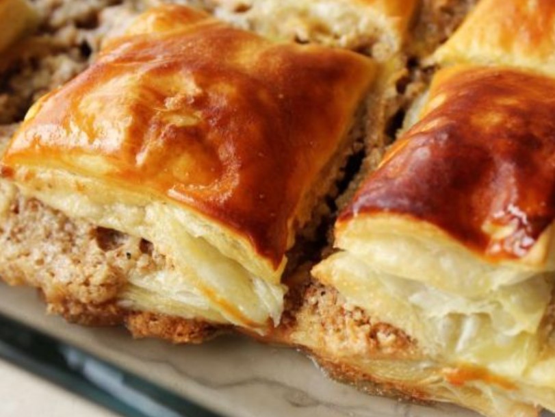 Cover it with a second sheet, lay out the filling again and cover with the last third sheet. Lubricate it with yolk.