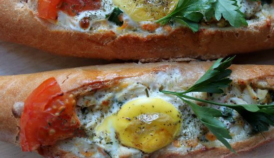 Pour the yogurt mixture over the sandwiches. Add a broken chicken egg and Provencal herbs on top. Layout the tomato slices on the sides. We will send the boat sandwiches 180 degrees into the oven, it will take 15-20 minutes. You can decorate the ready-made hot boat sandwiches with the remaining herbs.