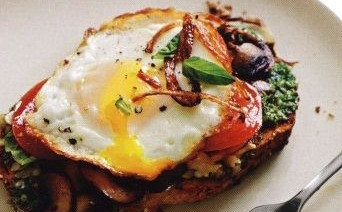 Put two slices of tomato on slices of bread with melted cheese, spread the mushrooms on them, and put one egg on top for each sandwich. Sprinkle with 1/4 teaspoon salt, fried shallots, and basil.