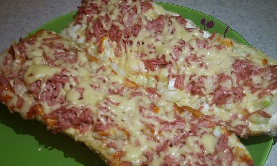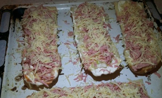 Cut the bread (longitudinally, in the form of boats), grease with mayonnaise, and tomato (you can do without tomato, as you like). Sprinkle a little cheese, put onions, brush a little with mayonnaise and tomato so that the onions are not dry.