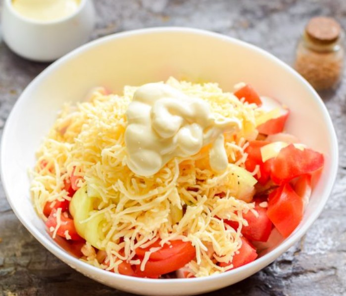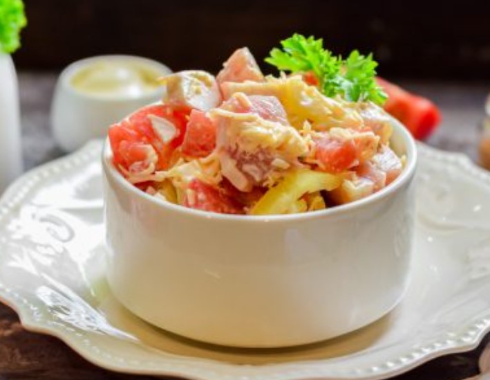 Today we are preparing the “Italian” salad with crab sticks – an unusual combination of sticks and dried meat, with the addition of pepper and tomato, gives a simply amazing result. The salad is delicious!