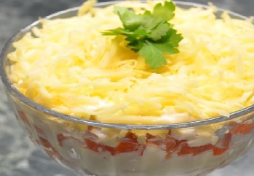 Delicious and satisfying puff salad with chicken and crab sticks. We hope that you will appreciate this recipe for a simple salad, and “Yummy in Italian” will become a decoration of your festive table.